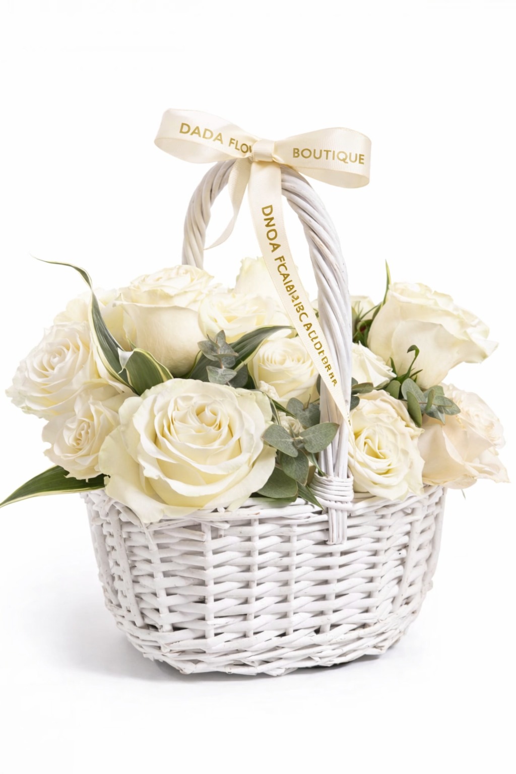 Coș Floral ”Ivory Serenity” – trandafiri albi în coșuleț alb | Dada Flower Boutique
