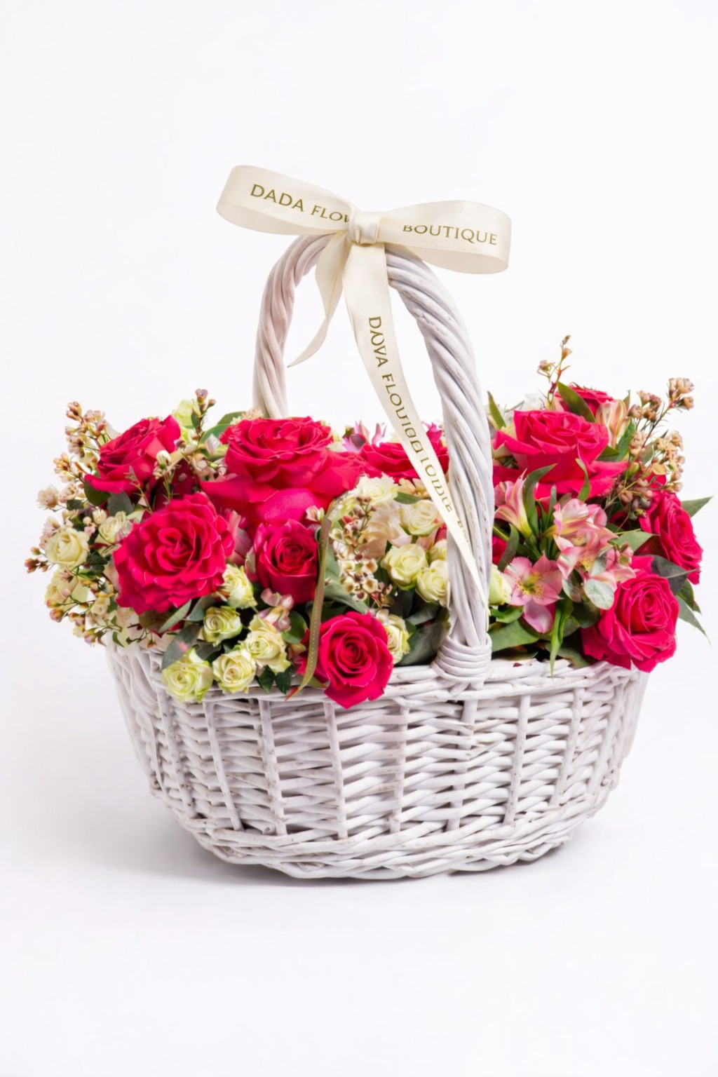 Coș Floral „Pink Garden Basket” – trandafiri și flori mixte în coș alb | Dada Flower Boutique