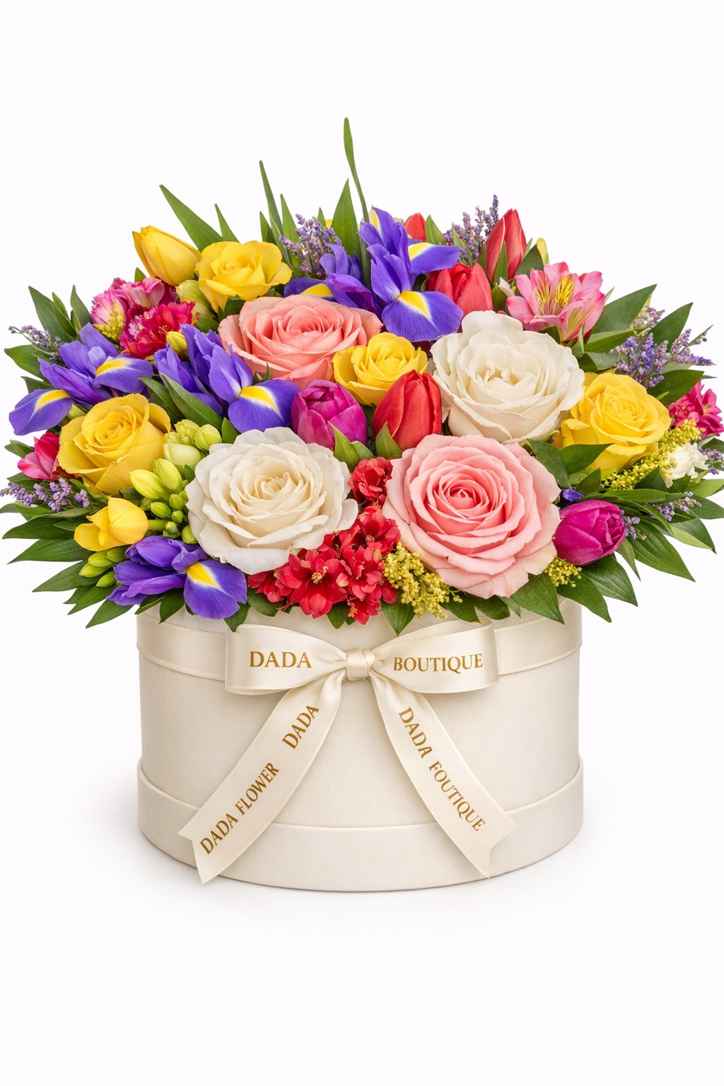 Un aranjament floral bogat și vesel, realizat manual în cutie elegantă DADA FLOWER BOUTIQUE, într-o combinație vibrantă de culori și flori de sezon. Perfect pentru aniversări, surprize speciale sau pentru a transmite energie și bucurie unei persoane dragi.