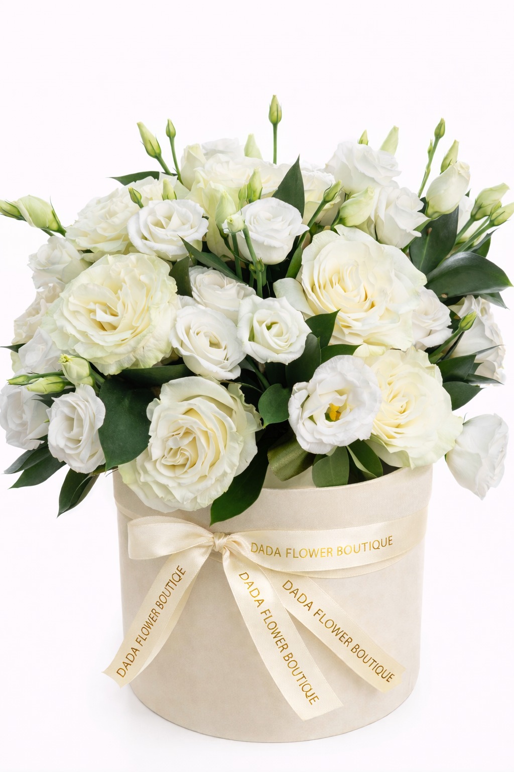 Un aranjament floral elegant în cutie de catifea ivory, realizat din trandafiri albi și eustoma delicată, completat de verdeață decorativă. Un cadou rafinat și luminos, potrivit pentru ocazii speciale sau gesturi de apreciere.