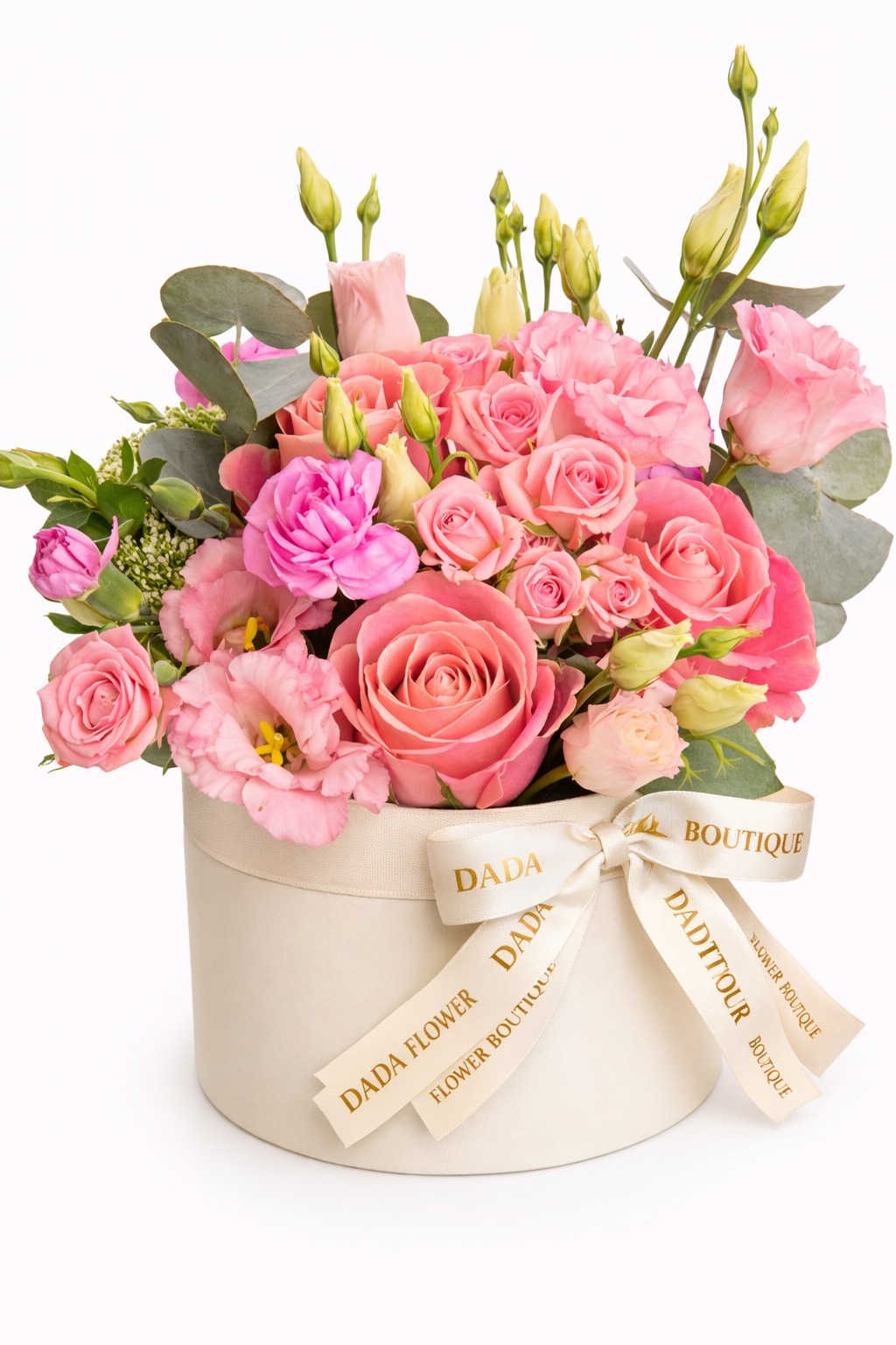 Florile sunt aranjate manual în atelierul Dada Flower Boutique, într-o cutie premium de catifea gri, decorată cu perle și panglică satinată. Fiecare detaliu este gândit astfel încât aranjamentul să arate impecabil încă din momentul livrării.