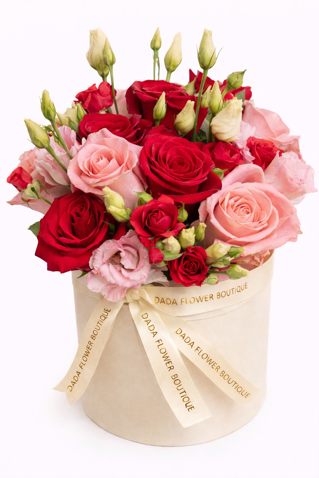 Un aranjament floral elegant și romantic realizat în cutie catifea, în nuanțe calde de roșu și blush, potrivit pentru declarații de iubire, aniversări sau momente în care vrei să impresionezi fără cuvinte.